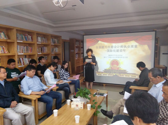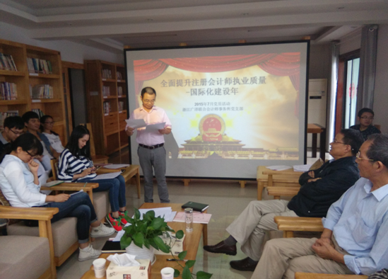 浙江广泽联合会计师事务所党支部结合庆祝建党九十四周年,开展“国际化建设年”主题活动作,全体党员和入党积极分子重温了党员的义务与权利等党的基础知识。章亚玲所长就认真学习实施省注协《注册会计师行业“国际化建设年”主题活动实施方案》作动员报告。章亚玲所长说,广泽所党支部和事务所认真学习了省注协《注册会计师行业“国际化建设年”主题活动实施方案》,并对开展活动作出部署,召开了专题会议和制发了文件,全体从业人员特别是事务所合伙人(股东)及党员,都要把握行业“国际化建设年”主题活动的有关要求和任务,并结合本单位的实际全面推进“国际化建设年”活动的开展。党支部要把“国际化建设年”活动作为今年党员工作的重中之重,事务所的合伙人(股东)要高度重视,深刻领会国际化建设的重大意义,本着对行业负责、对事务所负责的态度有效推进。所长亲自抓,务求取得推进事务所科学发展的实效。广泽与行业的“国际化”要求还相差较远,我们要在这次活动中,努力去学习、实践,首先从服务理念、执业标准上做起。我们的国家和经济进入新常态、新经济阶段,全党全国在全面落实习总书记提出的“四个全面”即全面建成小康社会、全面深化改革、全面依法治国、全面从严治党。党和国家的重大战略决策,对我们注册会计师行业既是挑战,也是机会,我们一定要练好内功,勇于面对新变化。