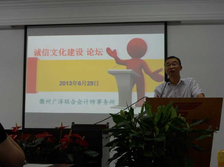 6月29日,为全面贯彻落实党的十八大精神,以邓小平理论、“三个代表”重要思想、科学发展观为指导,紧密围绕社会主义核心价值体系的构建,从全体从业人员执业实际出发,深入推进行业诚信的宣传、教育和实践,进一步巩固扩大已取得的建设成果,形成诚信为本、和谐为轴、专业为重、务实为要的广泽文化发展体系,提升诚信形象和注册会计师职业的社会认可度,凝聚起发展的强大合力,推动衢州广泽在行业内树牌、在社会上立信,根据省、市行业党委和注协开展注册会计师行业 “诚信文化建设年”活动的统一部署,结合本所实际,制定了以“诚信文化建设”为题的论坛。