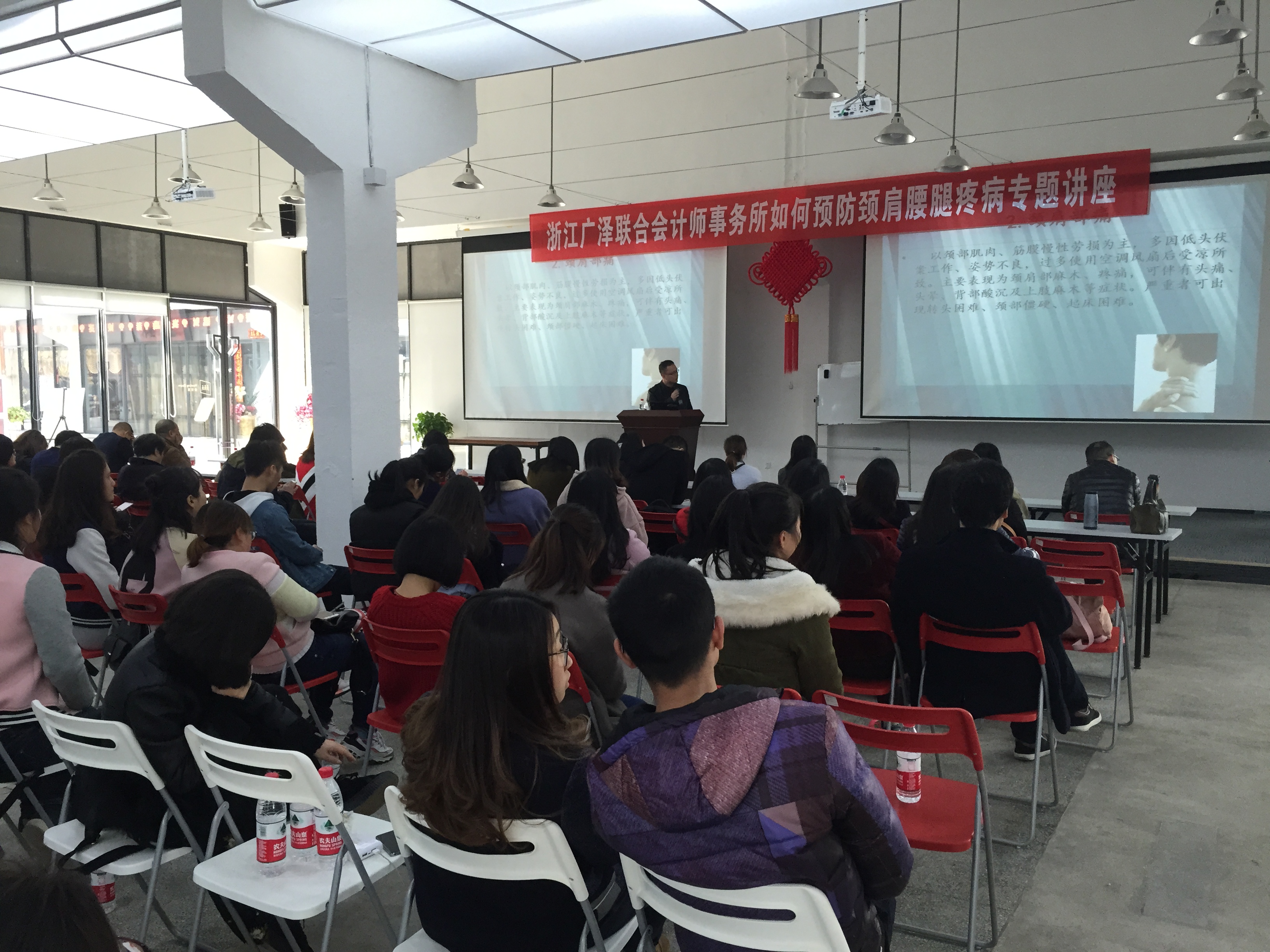 所谓“烟花三月下扬州”,当下正值春意盎然,正是出游的好时节;同时也是会计师事务所相对繁忙的时节。久坐不立、长期伏案的工作性质造成了许多审计人员普遍存在颈肩腰腿疼病,事务所为了缓解紧张的工作氛围,提高大家日常工作生活中对职业病的预防能力,特邀衢州市中医院中医师给大家讲解生活中如何预防颈椎类疾病,并现场示范动作小操,随时随地练习。